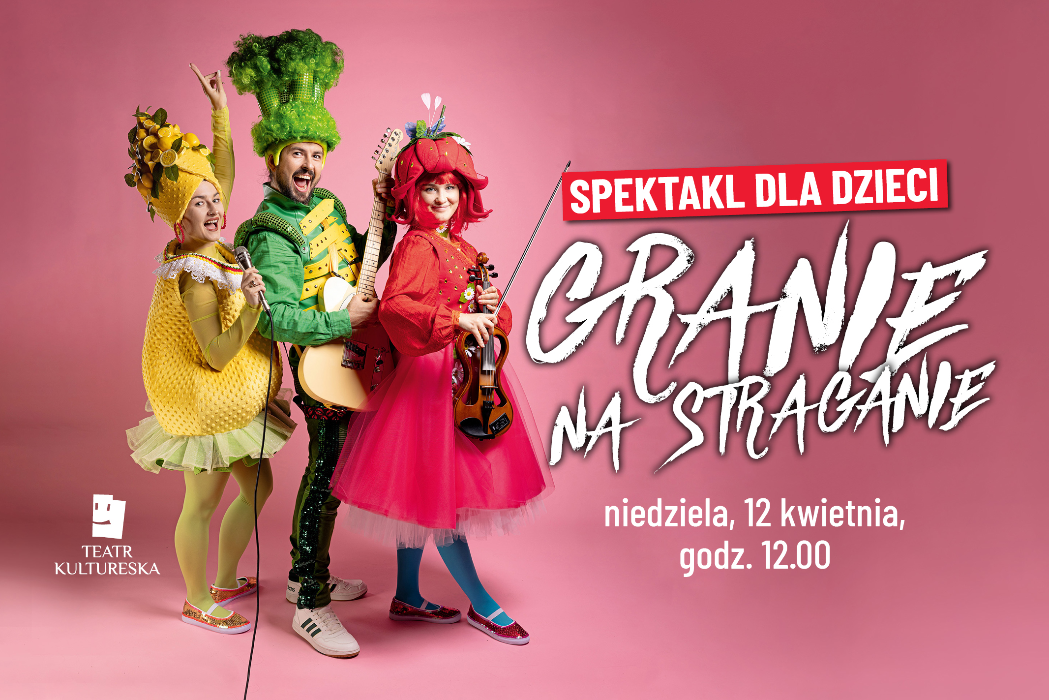 „Granie na straganie” to interaktywny witaminowy koncert dla dzieci. Widzowie wezmą udział w wyjątkowym show, które zorganizują dla nich warzywa i owoce. Zainspirowani wierszem Brzechwy uosobiliśmy Brokuła, Cytrynę i Poziomkę, które w naszym spektaklu, borykać się będą z tematami bliskimi współczesnym dzieciom. Każde z nich poszukuje swojej wartości, ucieka w świat fantazji i kreatywnie się bawi. Dzieci będą mogły przejrzeć się w naszych bohaterach, jak w lustrze i dowiedzieć się, że „wszystko, co naturalne musi być nieidealne”. Spektakl porusza tematy prawidłowego odżywiania, a także właściwych codziennych nawyków ekologicznych.W spektaklu aktorzy śpiewają na żywo, a także grają na instrumentach! Brokuł, Cytryna i Poziomka oczekują na straganie na klienta, który je kupi. Niestety… Nikt nie jest nimi zainteresowani. Zastanawiają się dlaczego, dostrzegając swoje niedoskonałości. Postanawiają odnaleźć swoją wartość w krainie wyobraźni, gdzie każdy może być kim chce. Przeobrażają się w witaminowy zespół muzyczny, który zachęci dzieci do właściwego odżywiania, codziennych dobrych nawyków, a także do dbania o przyrodę. W czasie koncertu dojdą do wniosku, że „wszystko, co naturalne musi być nieidealne” i że ich wartość, wcale nie jest na zewnątrz, ale w głębi ich serc. Czas trwania spektaklu ok. 60 minut Spektakl adresowany jest do dzieci w wieku przedszkolnym i wczesnoszkolnym (3-11 lat). Jak każde przedstawienie Teatru Kultureska jest to też doskonała rozrywka rodzinna – świetnie bawić będą się także dorośli. Cena biletu na spektakl: 30 złBilety można kupić pod linkiem: https://iframe124.biletyna.pl/ i w kasie Domu Kultury Stare Babice.